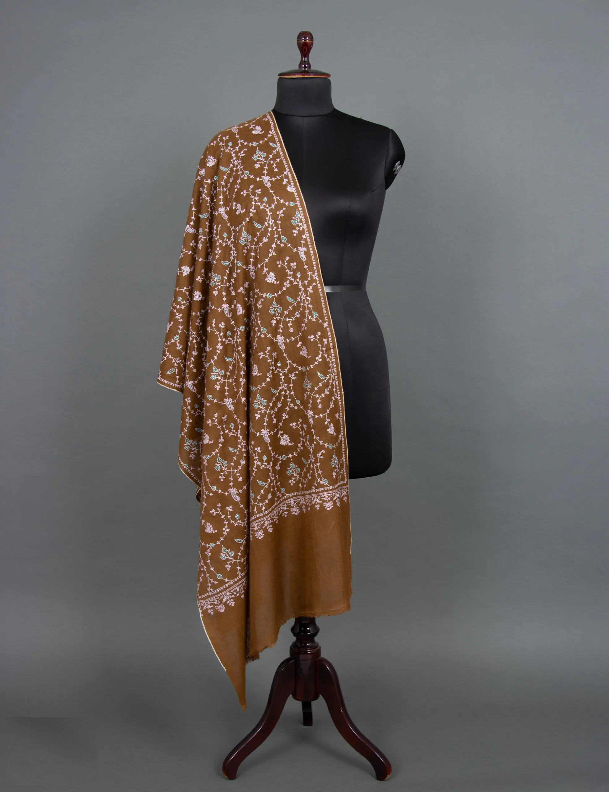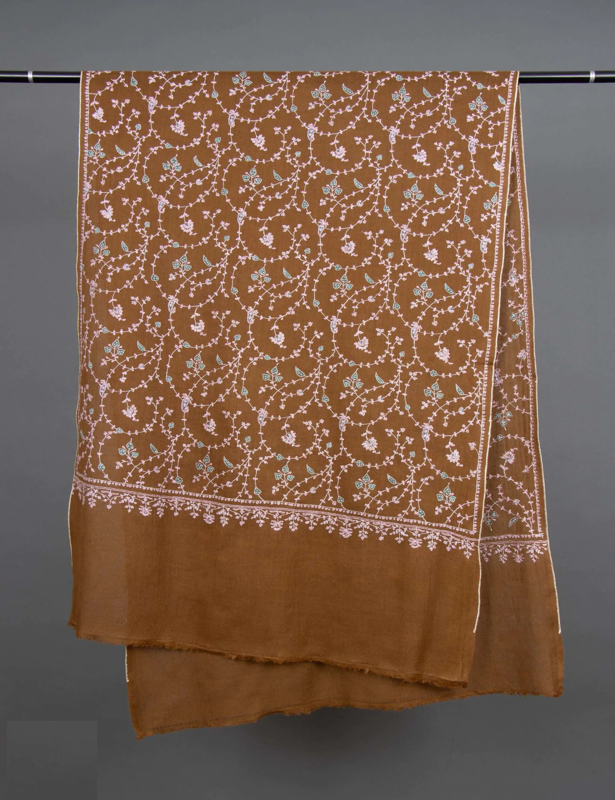 The brown cashmere scarf with white embroidery is a luxurious pashmina wrap that celebrates heritage art through its handwoven craftsmanship and intricate embroidery motifs. Each stitch reflects the skill of artisans who passionately create these masterpieces. The scarf’s history traces back to royal origins, once exclusively crafted for kings and nobility. The finest Cashmere wool, sourced manually from Ladakh, guarantees unparalleled softness and warmth. The delicate embroidery motifs contribute an elegant touch, reminiscent of the regal wraps that gained global renown.