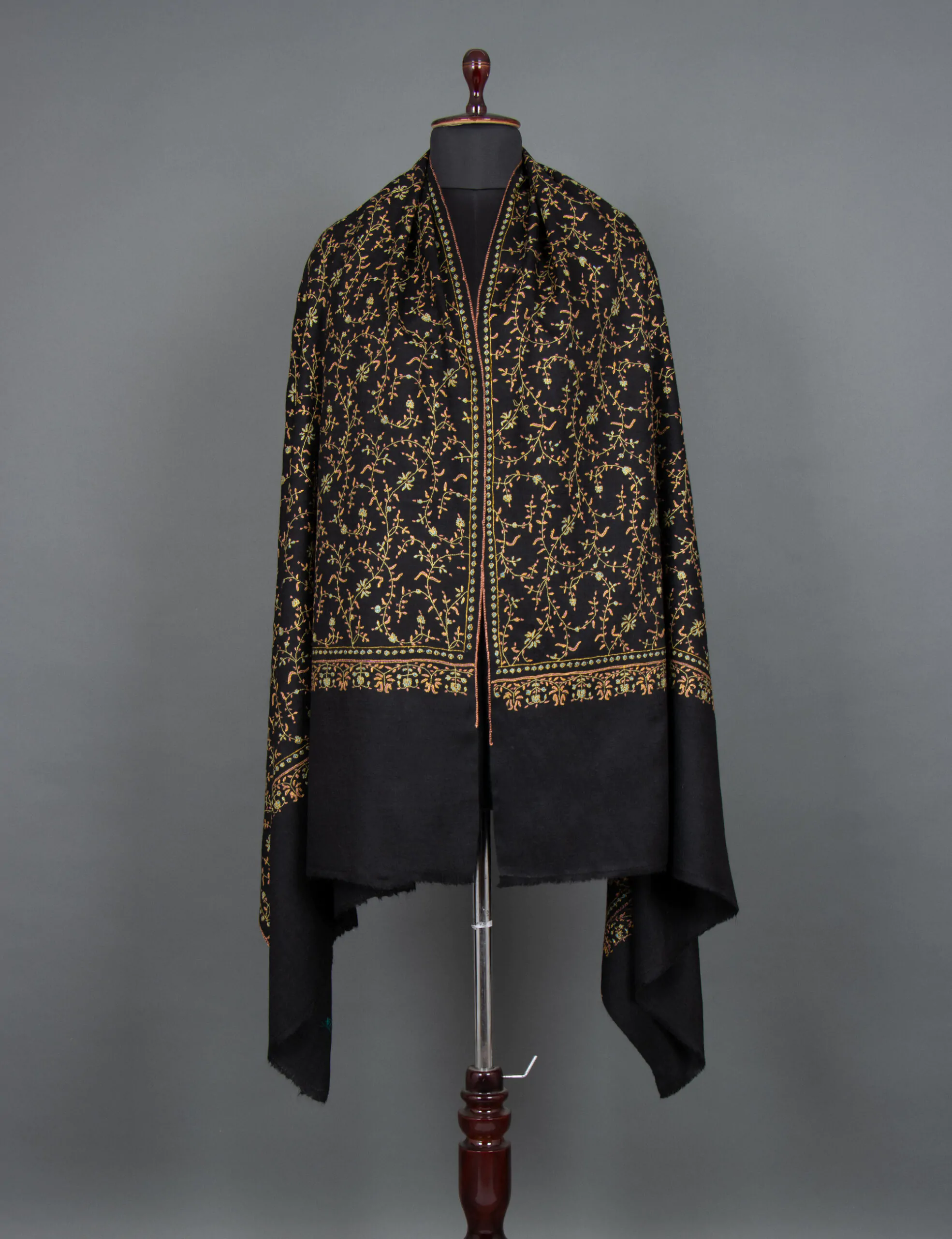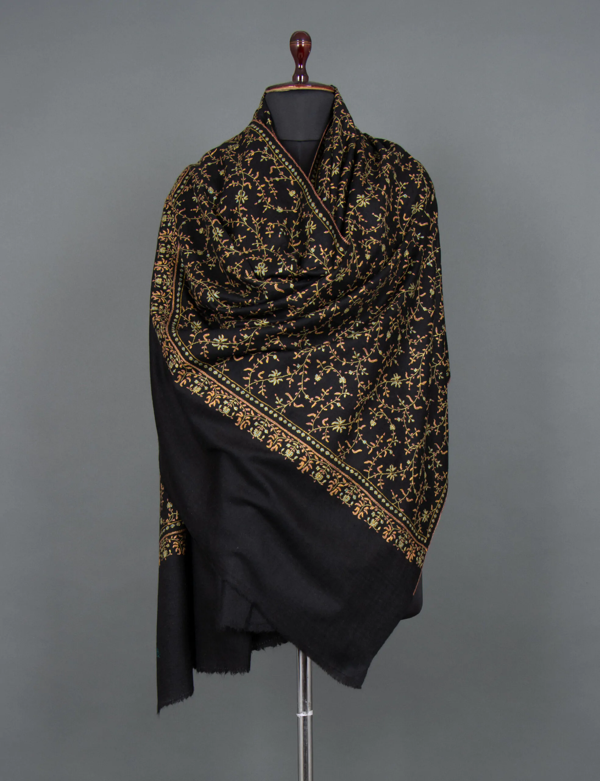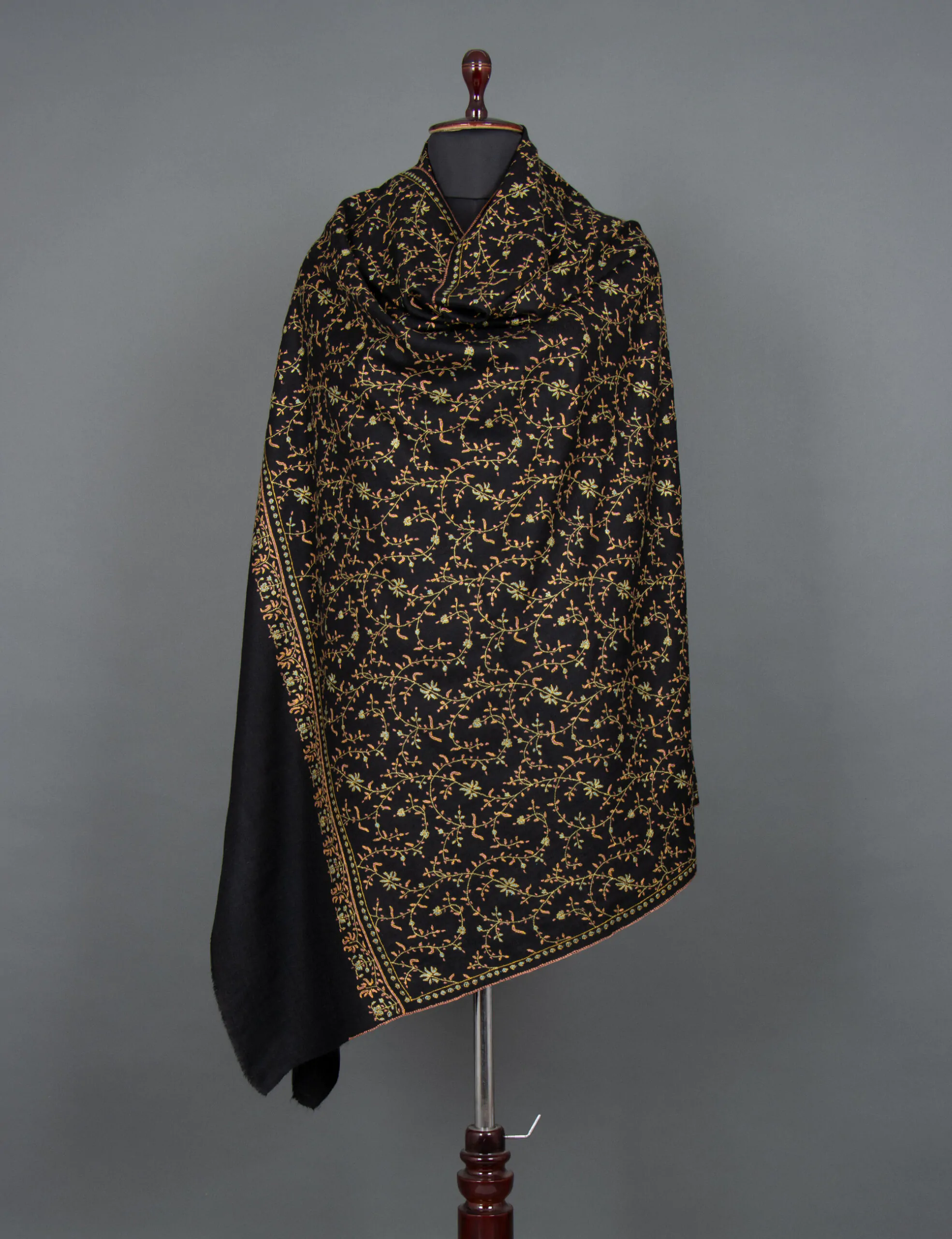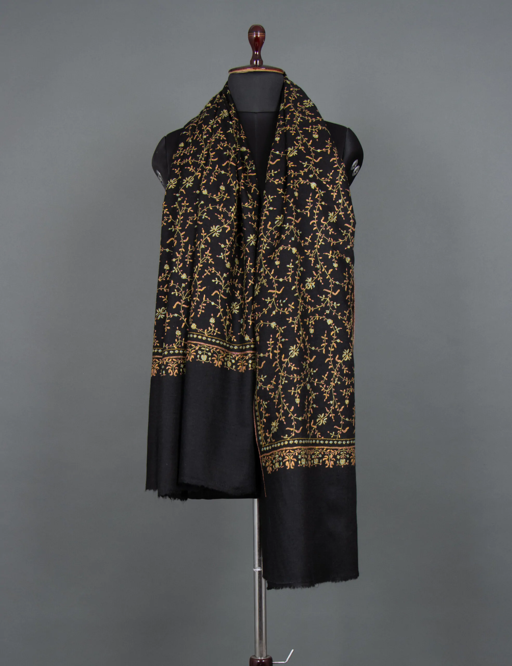 Introducing the “Infinite Night Sky” Pashmina Shawl – a timeless masterpiece that blends luxury and heritage. Immerse yourself in the allure of intricate black embroidery motifs gracefully adorning this handwoven shawl, a captivating homage to the union of Cashmere craftsmanship and traditional embroidery. Originally crafted for royalty, this piece is a symbol of regal elegance, with each stitch echoing the rich heritage of Ladakh’s finest Cashmere wool. Elevate your style with a touch of opulence and history, a wearable work of art that transcends time.