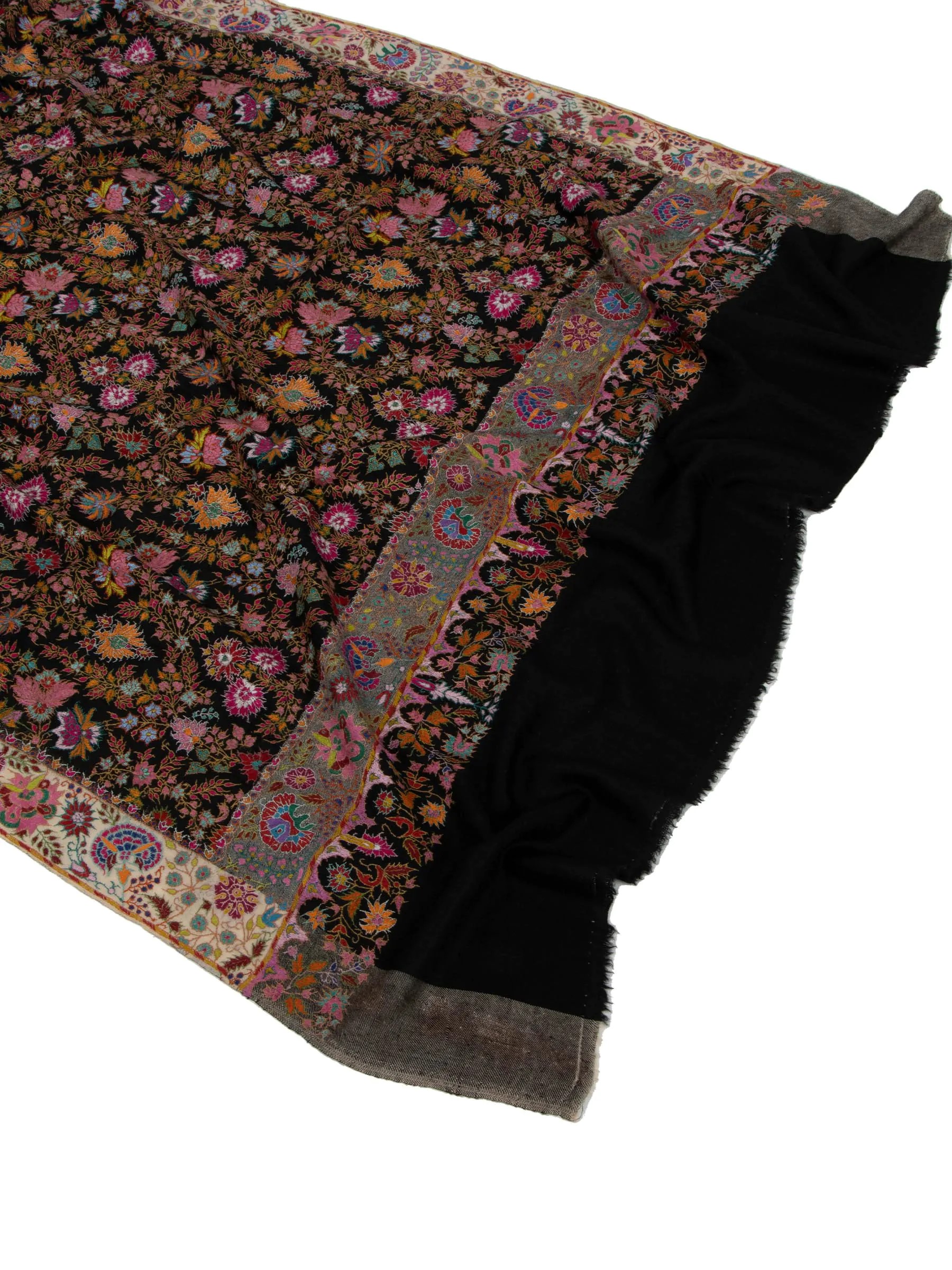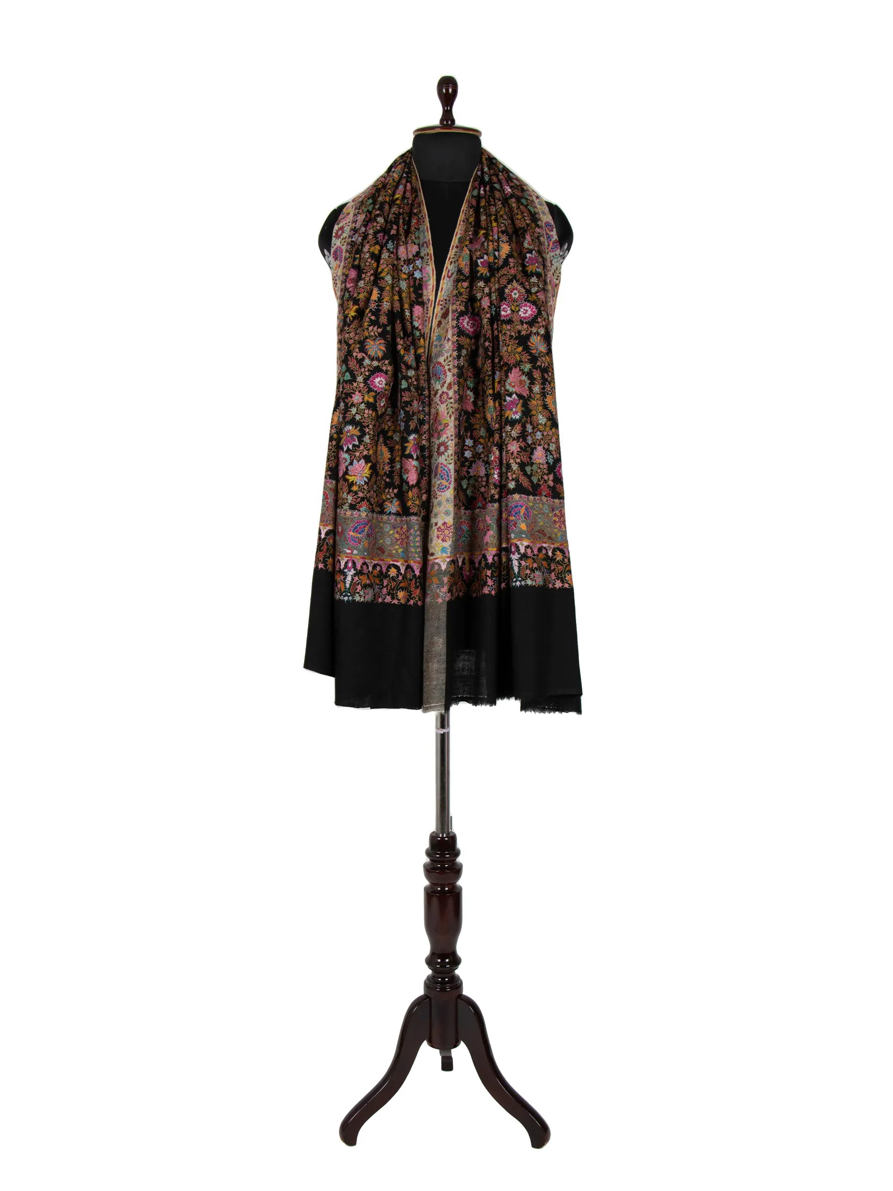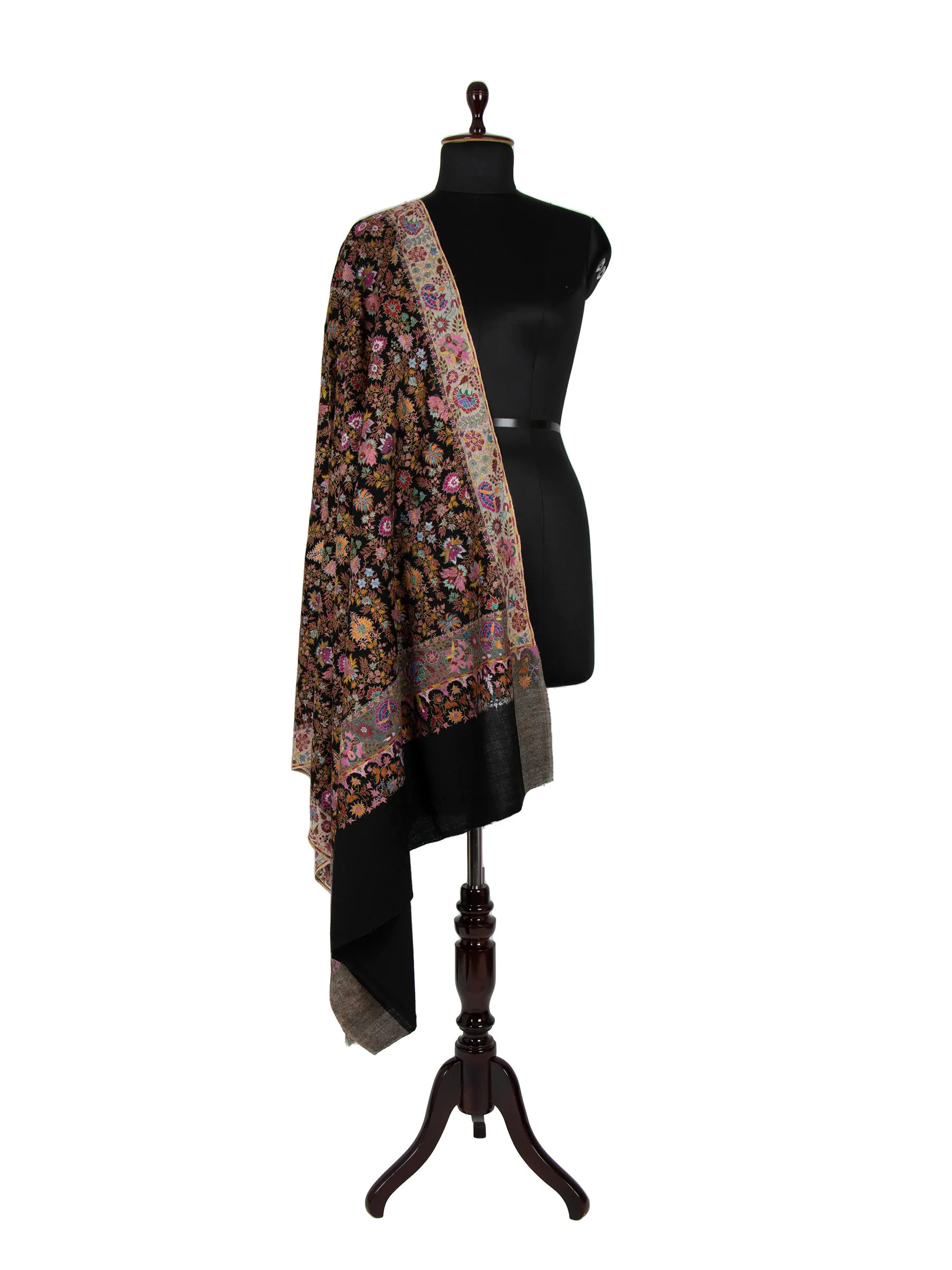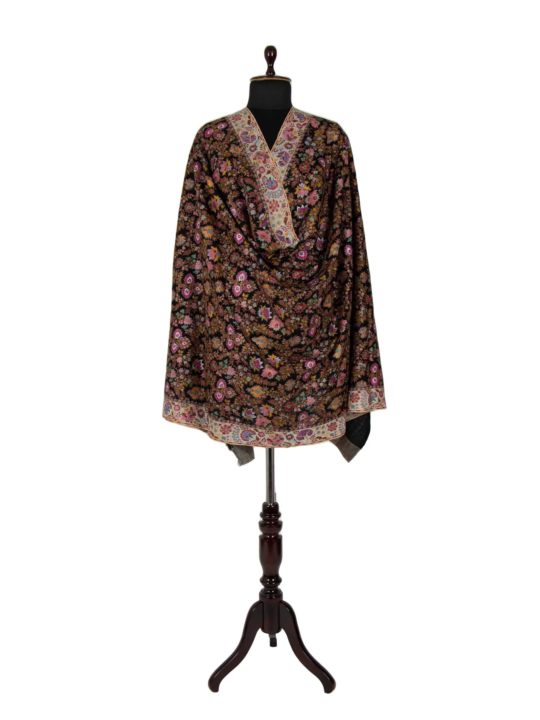 This stunning shawl features traditional Jamawar embroidery on a black background, showcasing intricate paisley and floral designs. Crafted from high-quality Pashmina wool, it offers a luxurious and elegant appearance while providing warmth and softness. Ideal for various occasions, this shawl combines traditional techniques with a touch of sophistication.