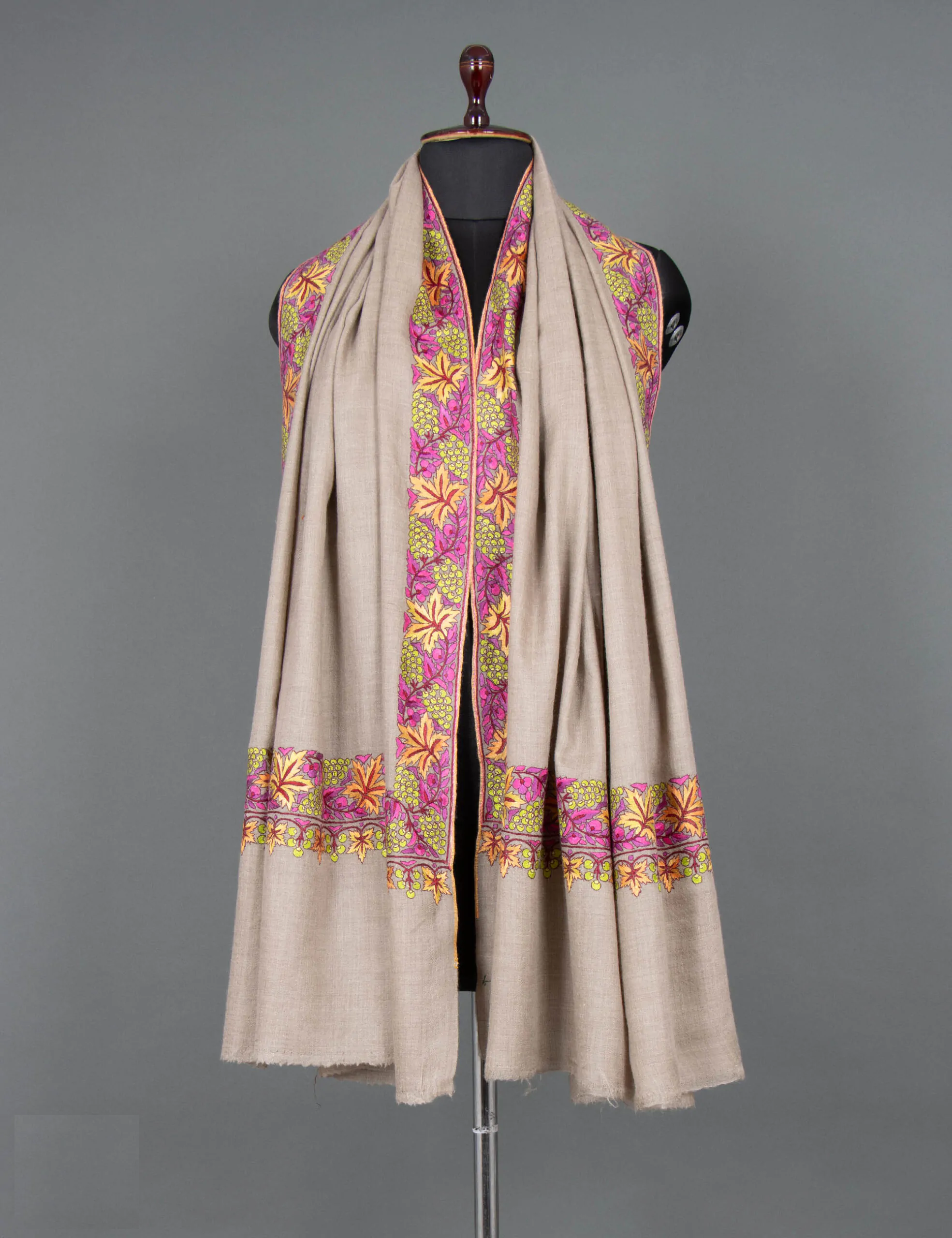 Introducing our Mapel Leaf Design Kashmir Pashmina Shawl, a true masterpiece that promises to mesmerize with its stunning embroidery. Meticulously crafted by skilled artisans, this shawl is a seamless blend of elegance and artistry. The delicate threadwork creates a symphony of colors, transforming it into a captivating accessory that effortlessly enhances any outfit.
