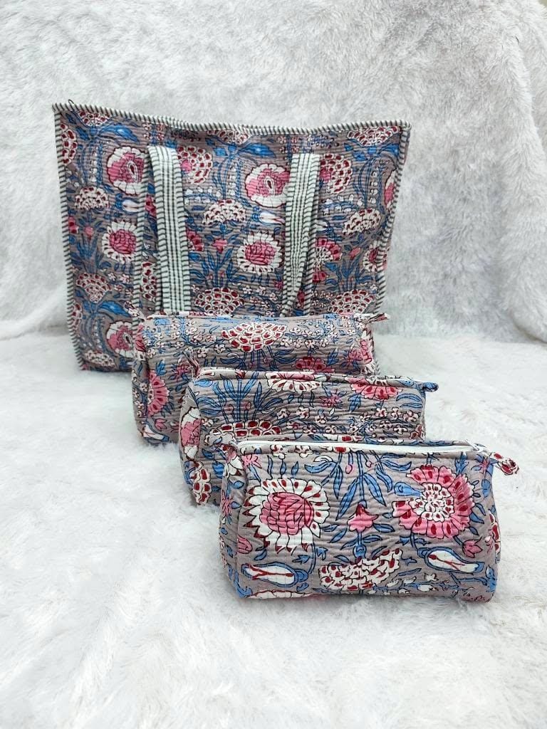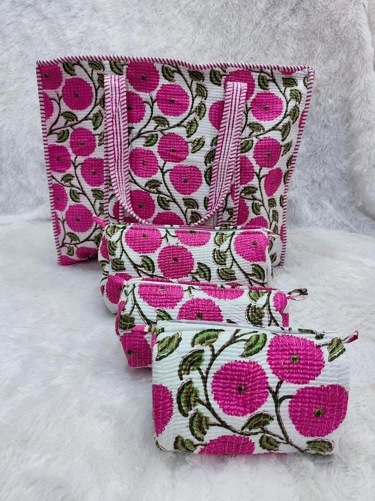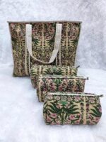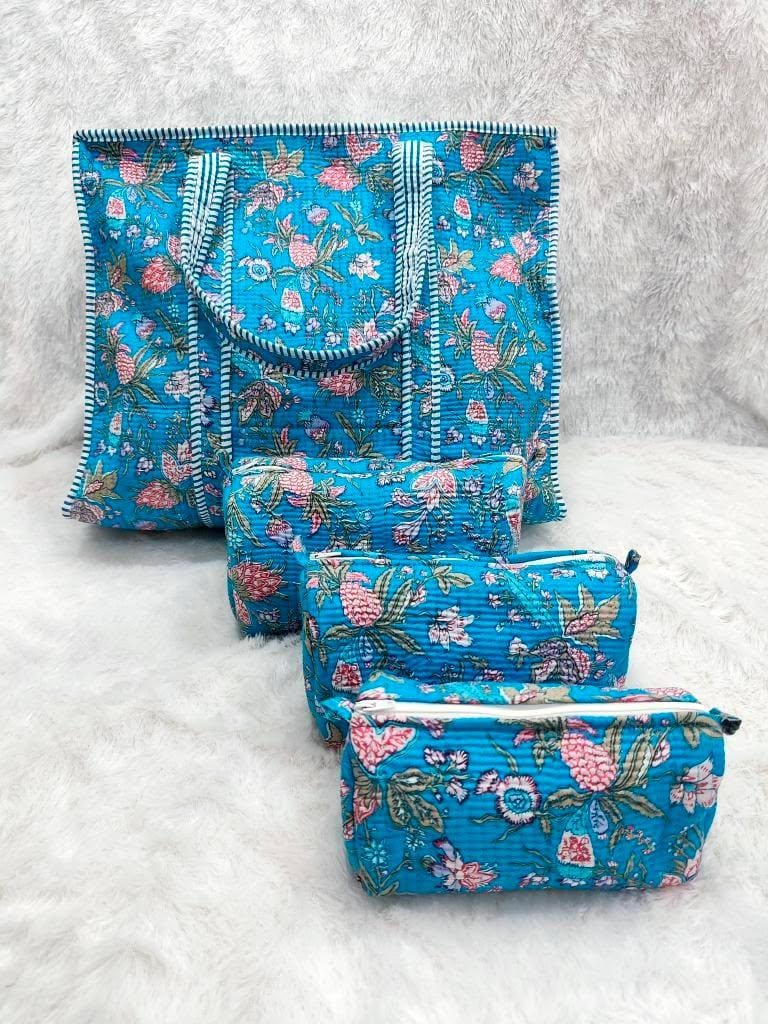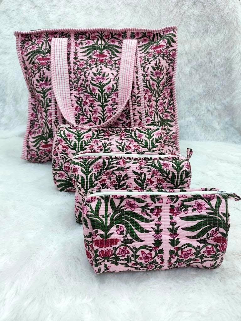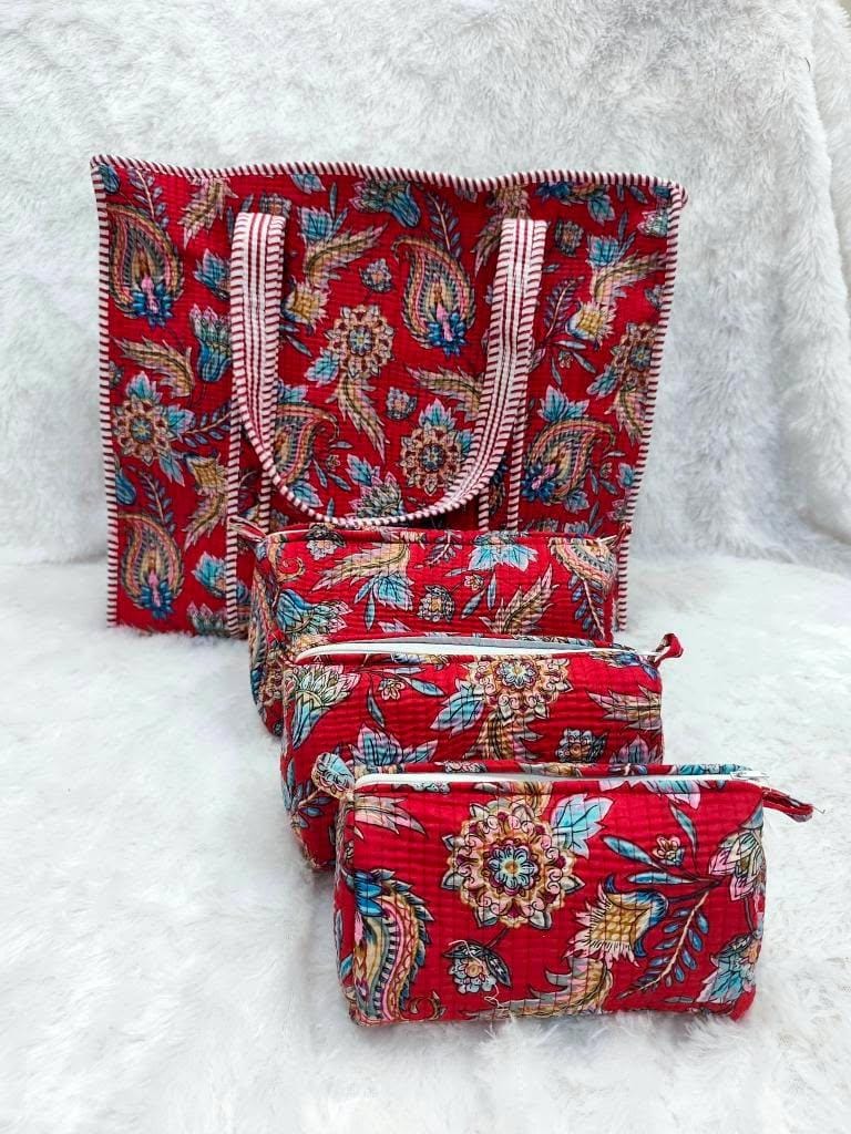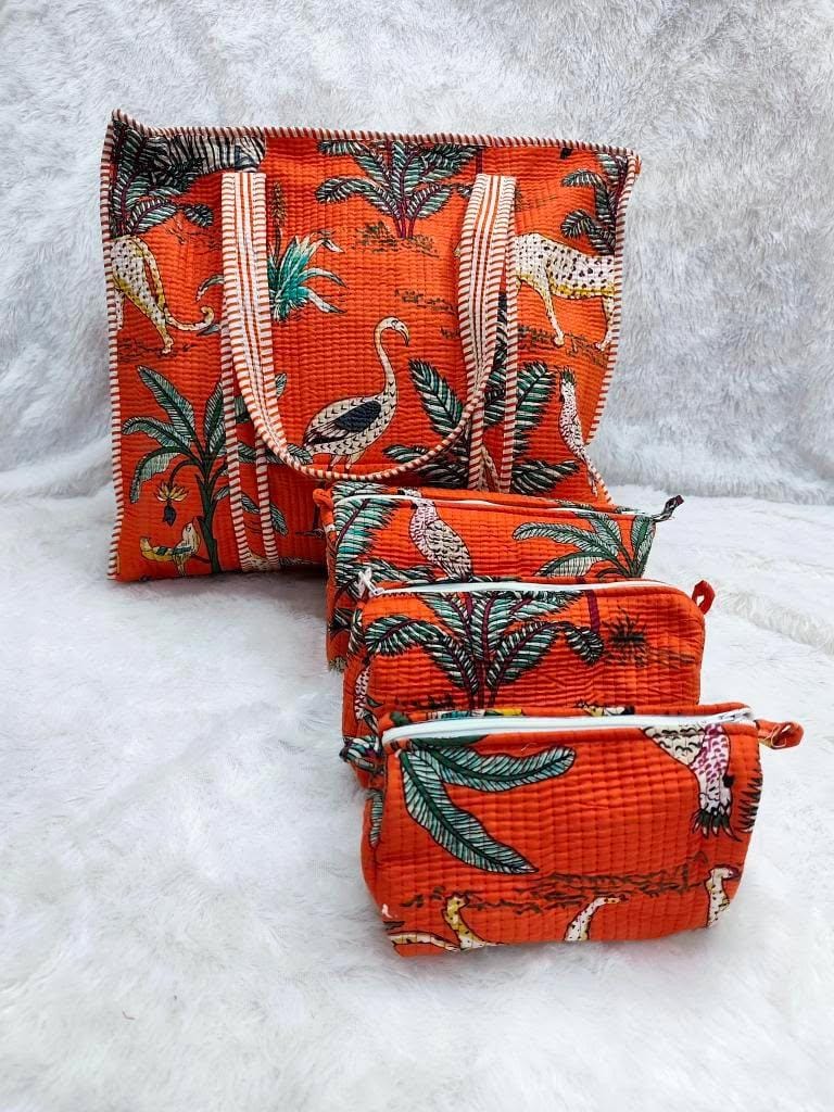 A vibrant, handcrafted collection featuring one large tote and three matching zippered pouches. Made from premium quilted fabric in a striking orange color with tropical bird and palm tree prints. Perfect for shopping, travel, or everyday use. Stylish, spacious, and eco-friendly.