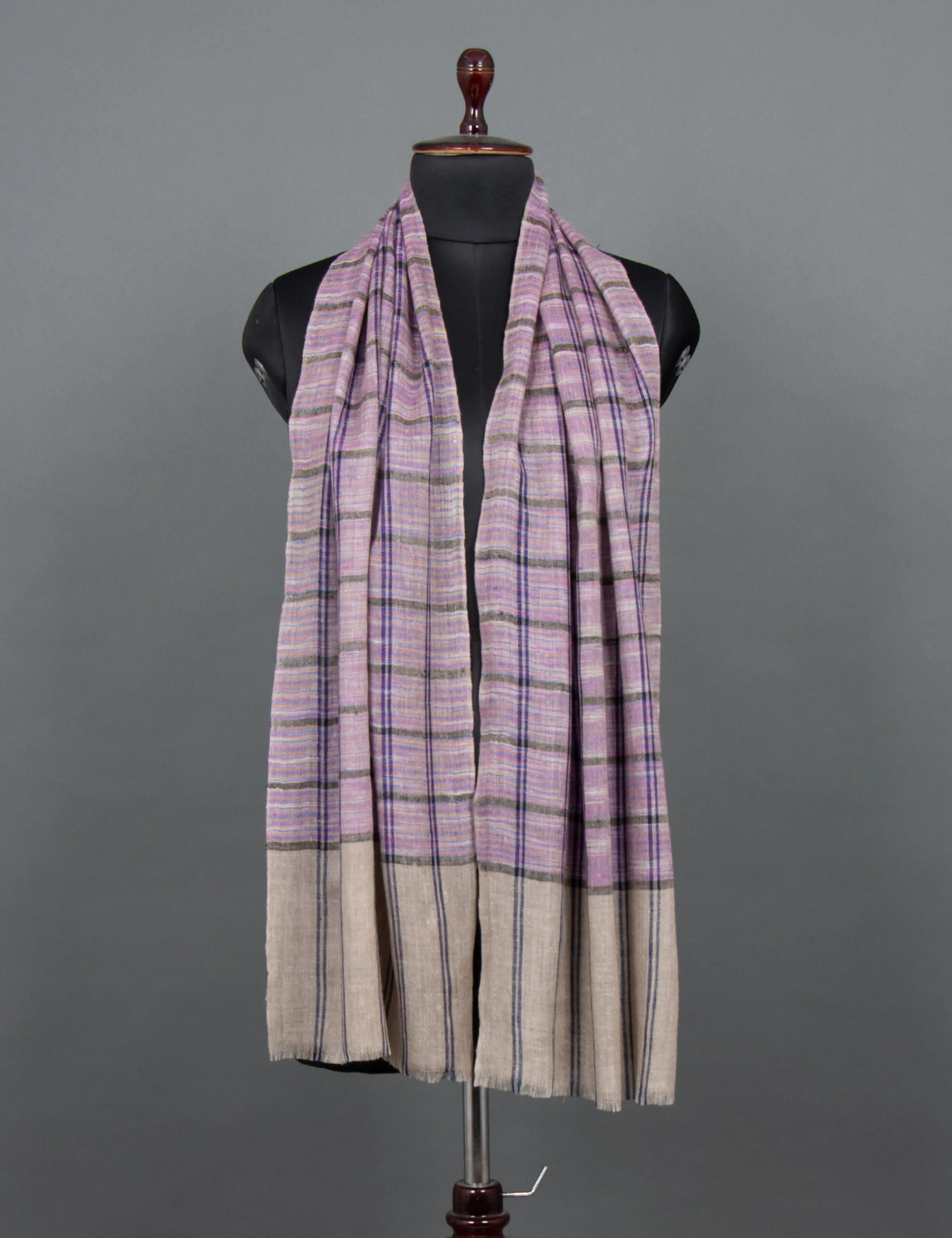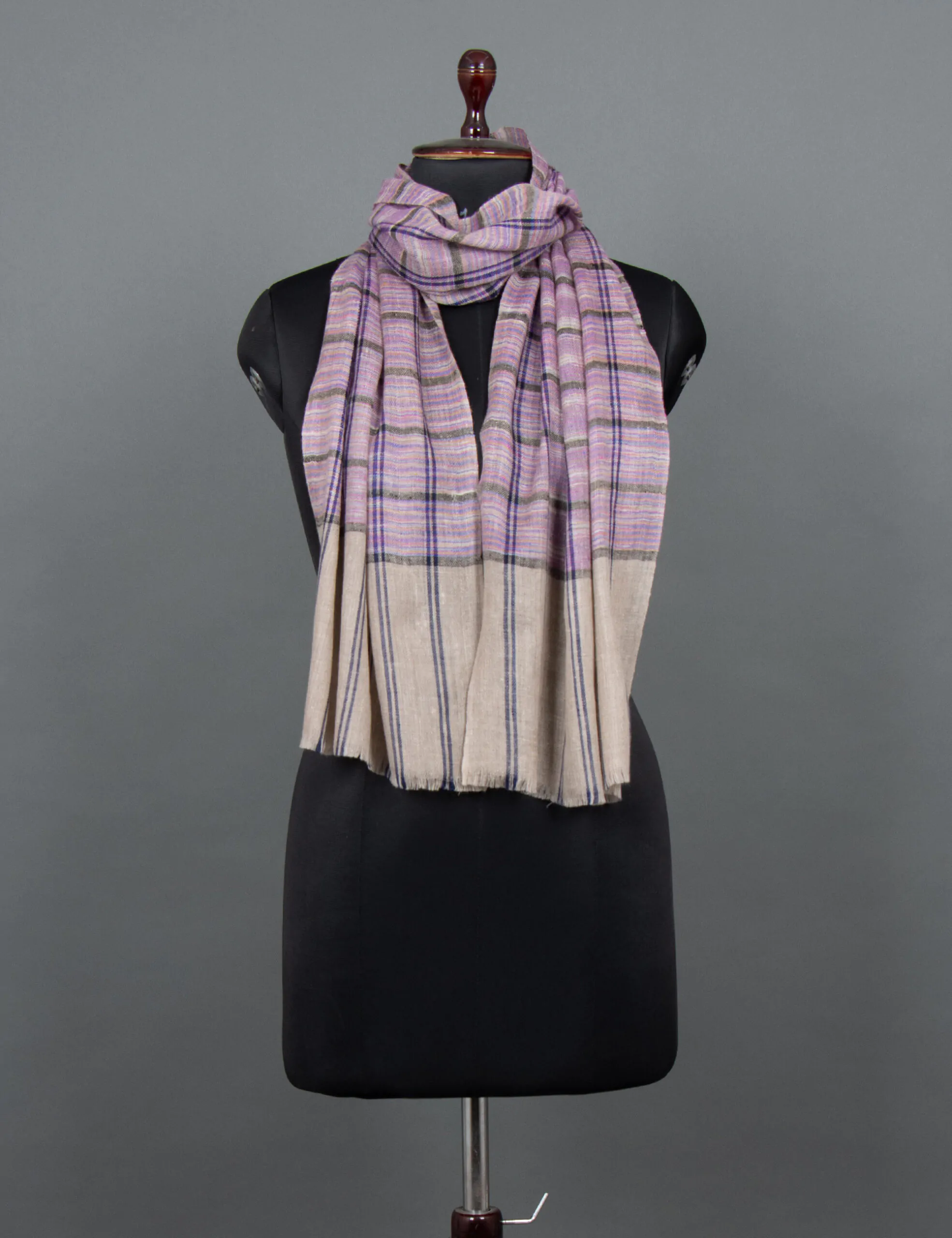 “Royal Cascade: A luxurious beige base Pashmina Striped Muffler, meticulously hand-embroidered with skilled craftsmanship, weaving a tale of timeless beauty. The subtle charm of this exquisite piece, adorned with delicate stripes, effortlessly elevates any outfit.”